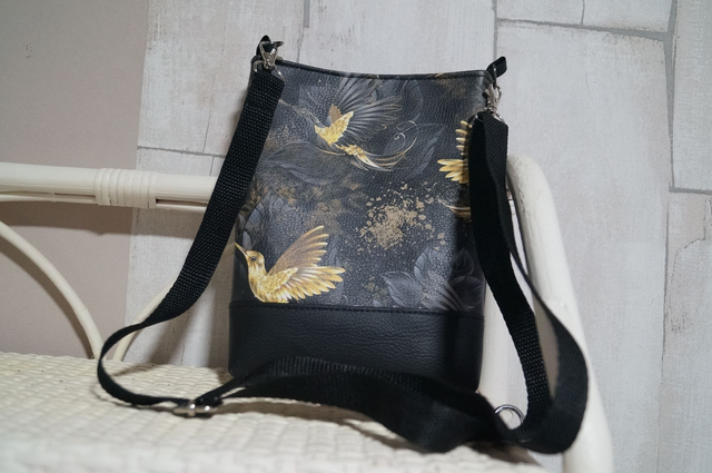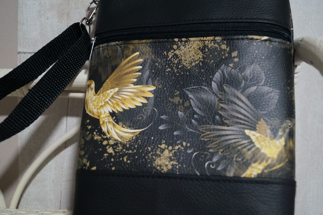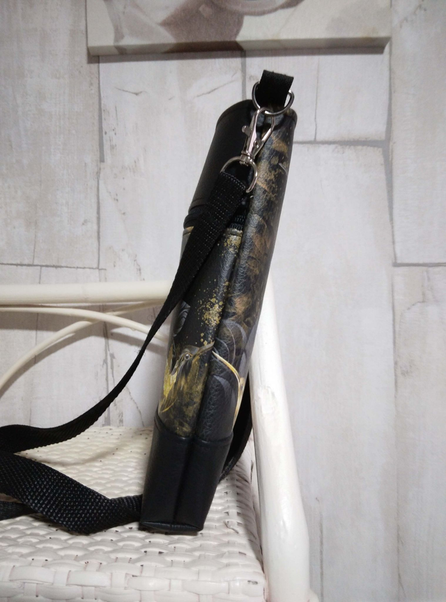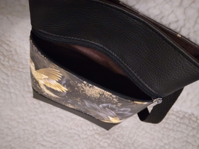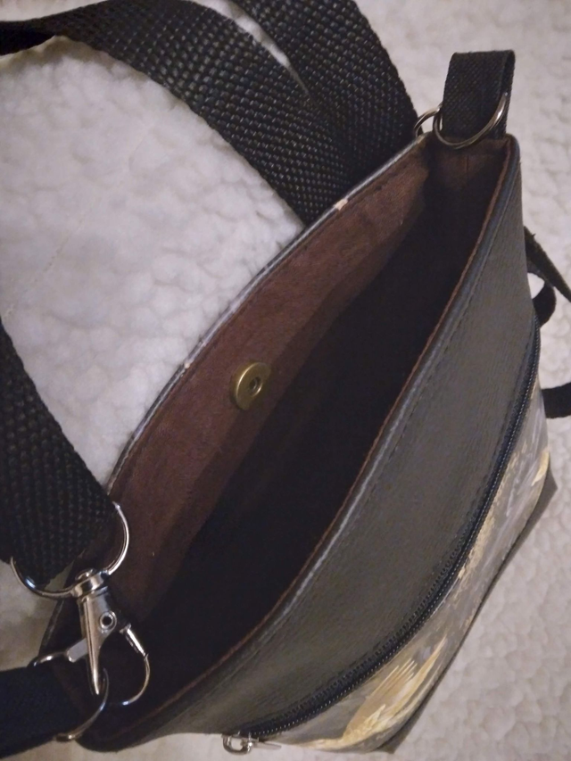 Pochette pour téléphone portable. Extérieur en simili imprimé. Fermeture zippée sur le devant et fermeture par bouton magnétique pour la pochette principale. Doublure en coton marron. Sangle réglable.