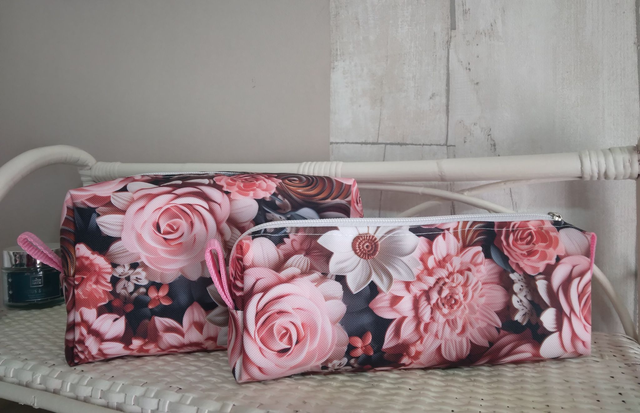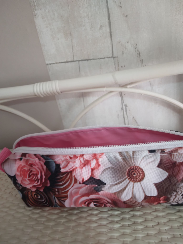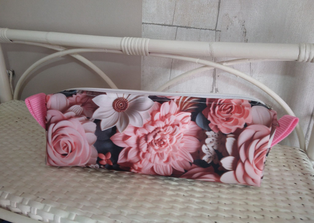 Trousse rectangulaire. En polyester imperméable extérieure imprimé et intérieur rose.